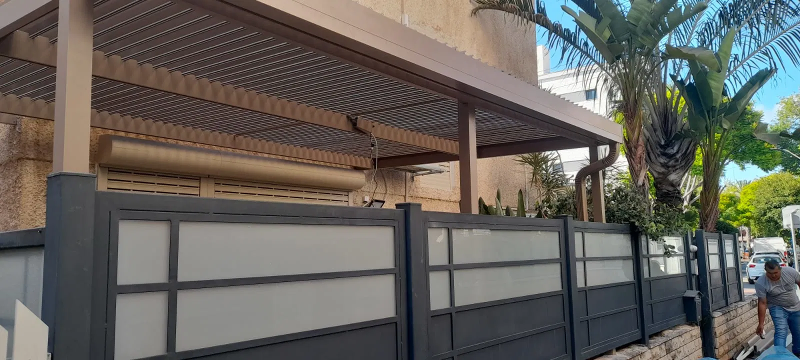 פרגולה אלומיניום עם הצללה דמוי עץ