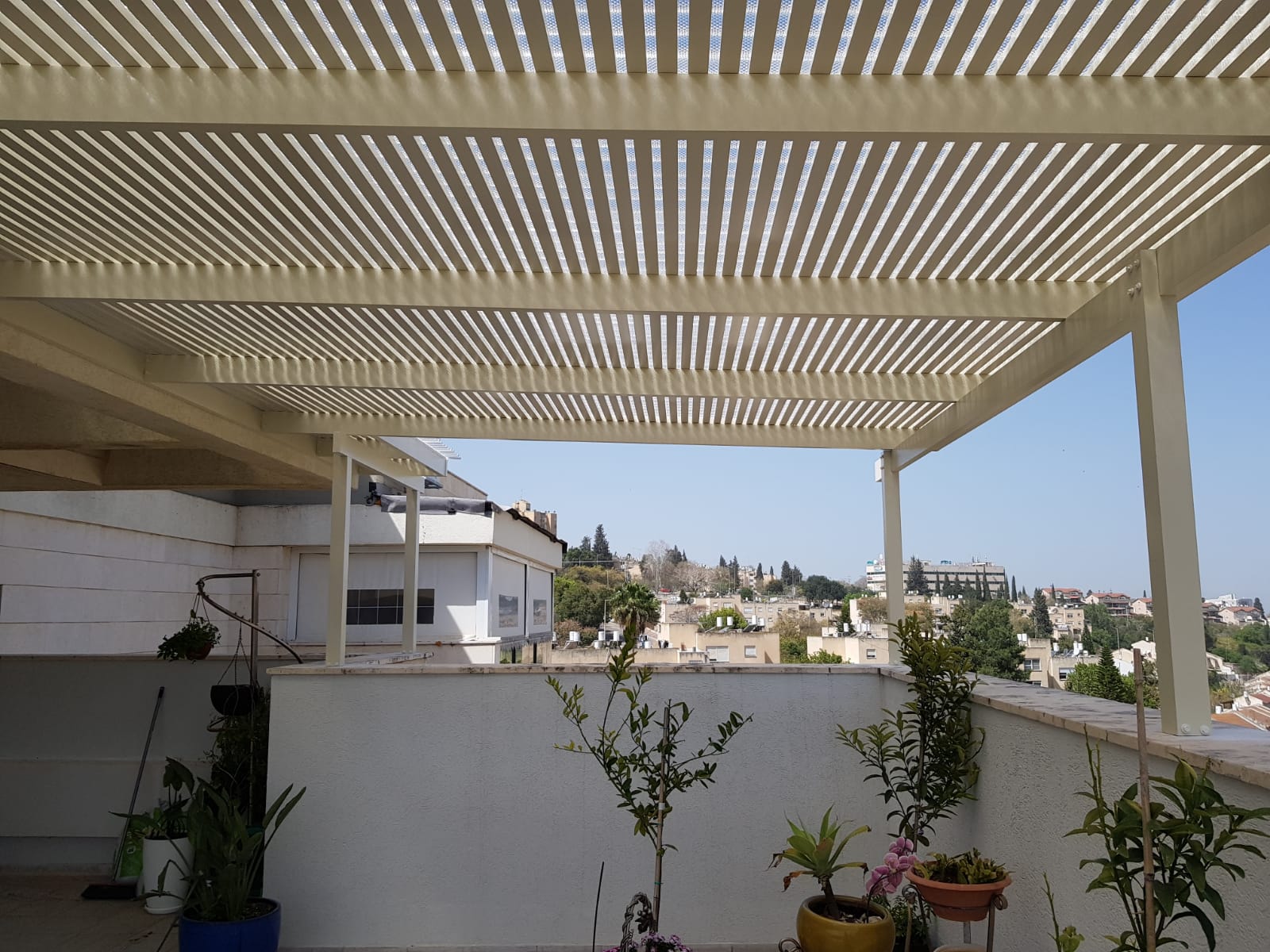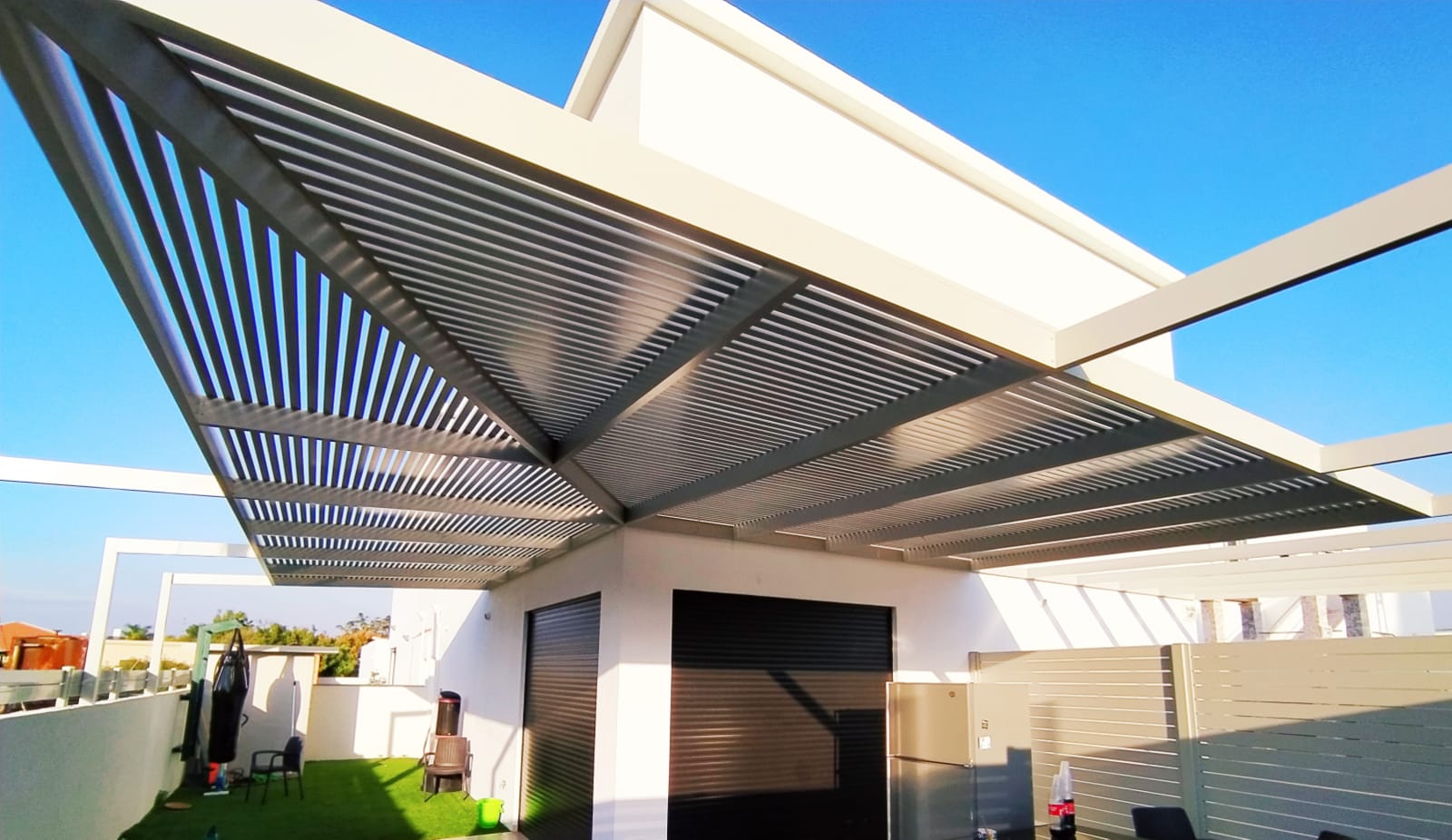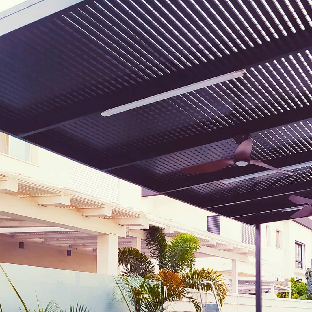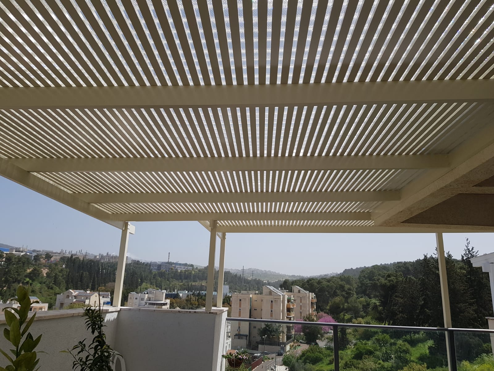 פרגולה קבועה הצללה עליונה. פרגולת אלומיניום קבועה דגם היי-טק הצללה עליונה פרופיל 120/40 רווח 2 ס”מ או 3-4 ס”מ קרוי נגד חדירת גשם סנטף\סנטף BH שקוף. פרגולת הייטק היא פרגולה עם טוויסט מודרני. עשוייה מאלומיניום ובעלת עיצוב מלוטש והיי-טקי. פרגולות אלו מותקנות בדרך כלל במרפסות, בתי עסק או בכניסה לבתים.