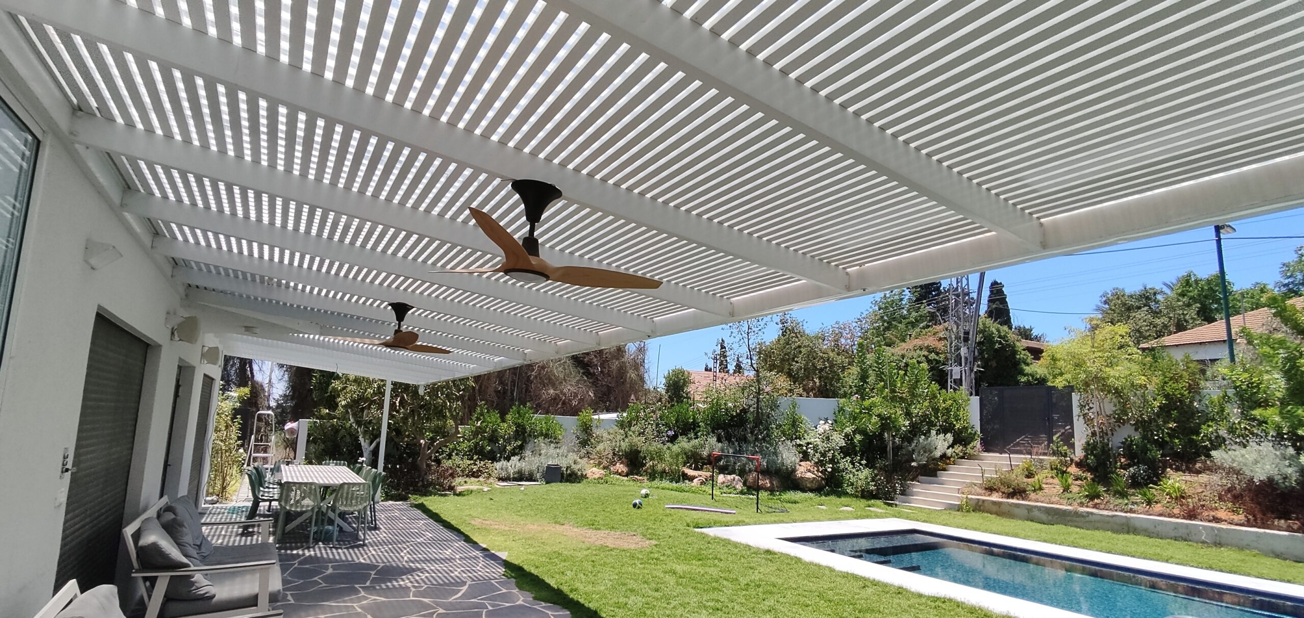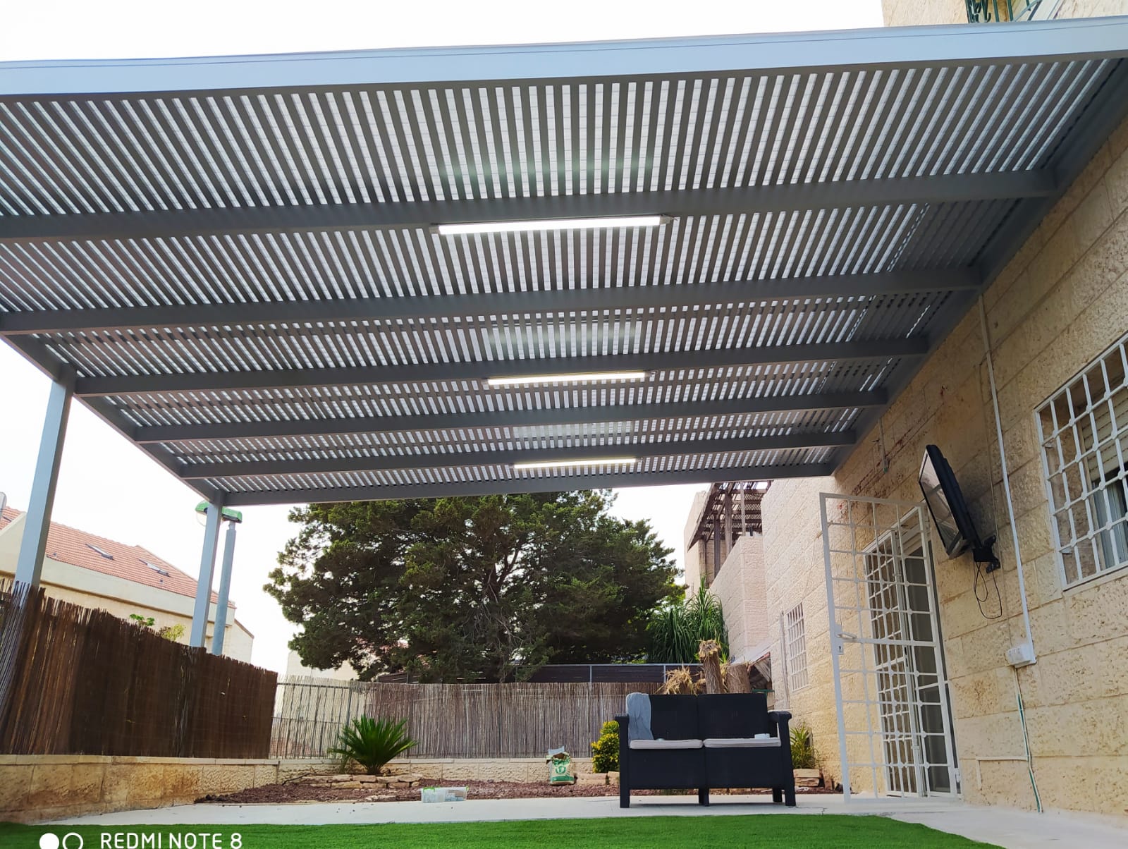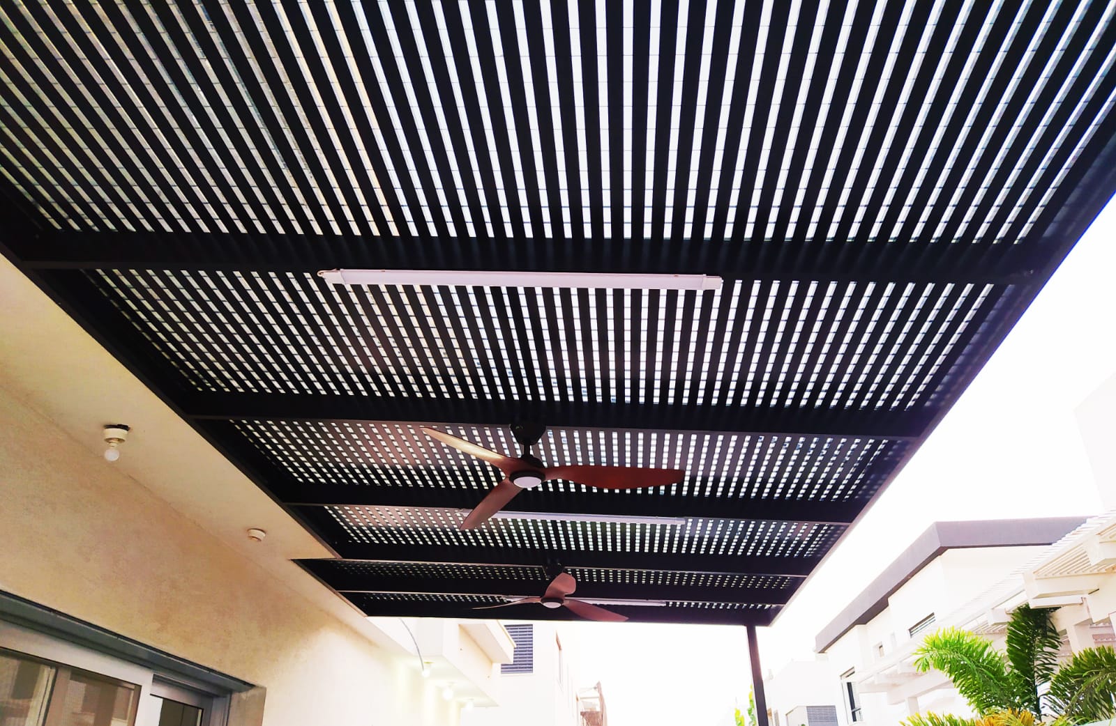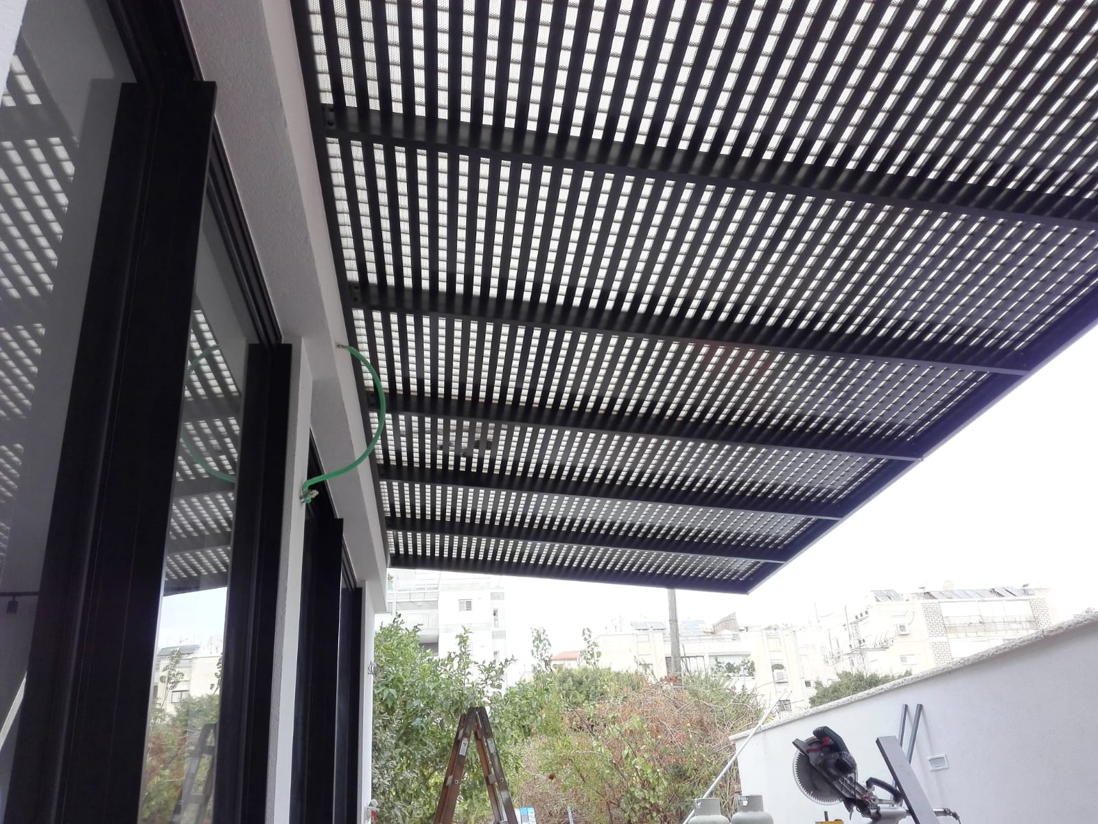 פרגולה קבועה הצללה עליונה. פרגולת אלומיניום קבועה דגם היי-טק הצללה עליונה פרופיל 120/40 רווח 2 ס”מ או 3-4 ס”מ קרוי נגד חדירת גשם סנטף\סנטף BH שקוף. פרגולת הייטק היא פרגולה עם טוויסט מודרני. עשוייה מאלומיניום ובעלת עיצוב מלוטש והיי-טקי. פרגולות אלו מותקנות בדרך כלל במרפסות, בתי עסק או בכניסה לבתים.