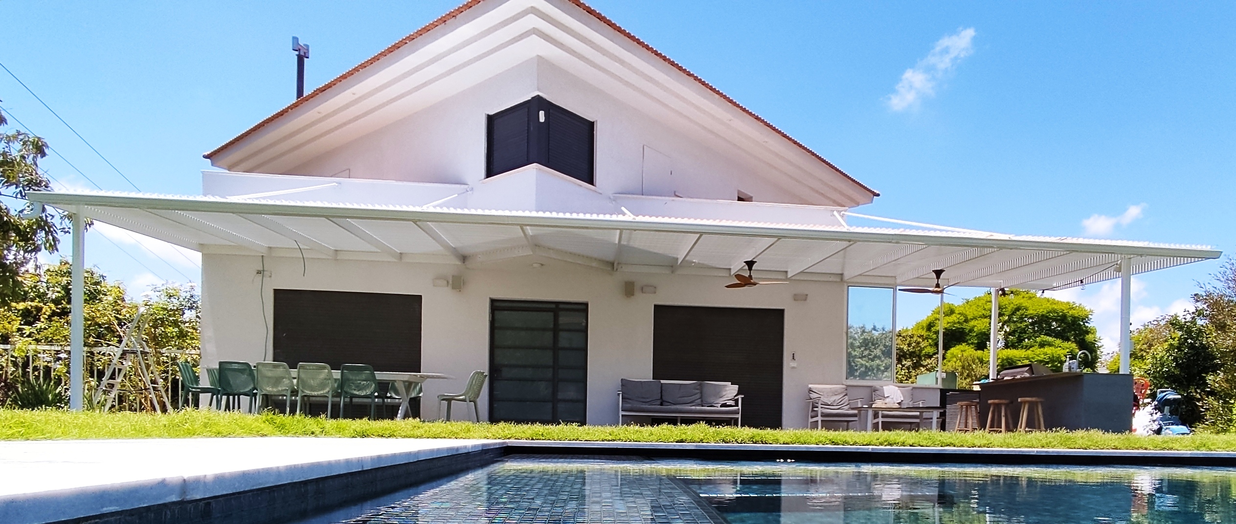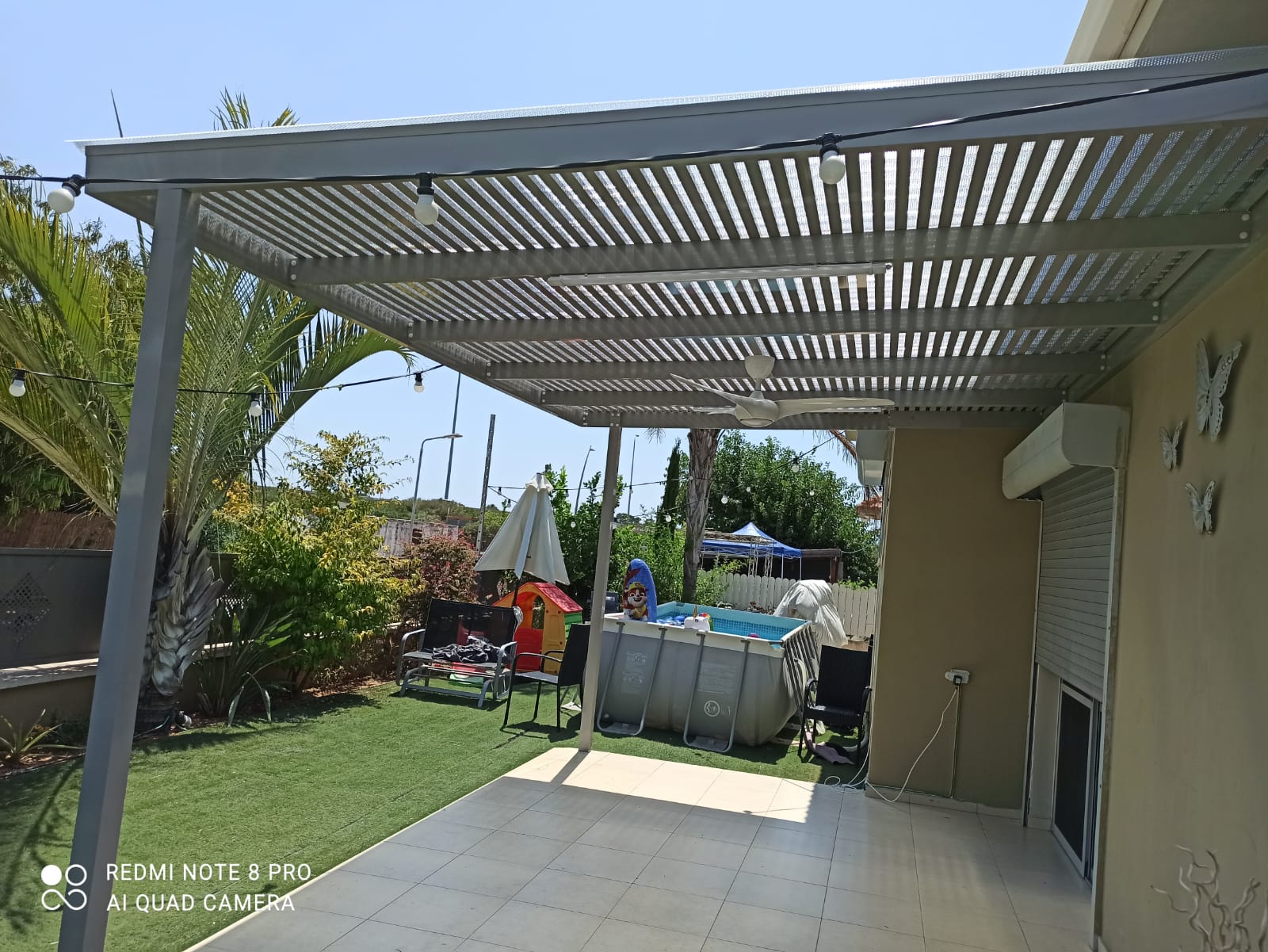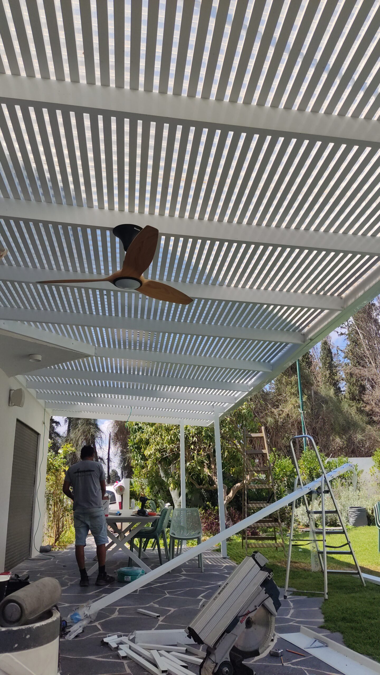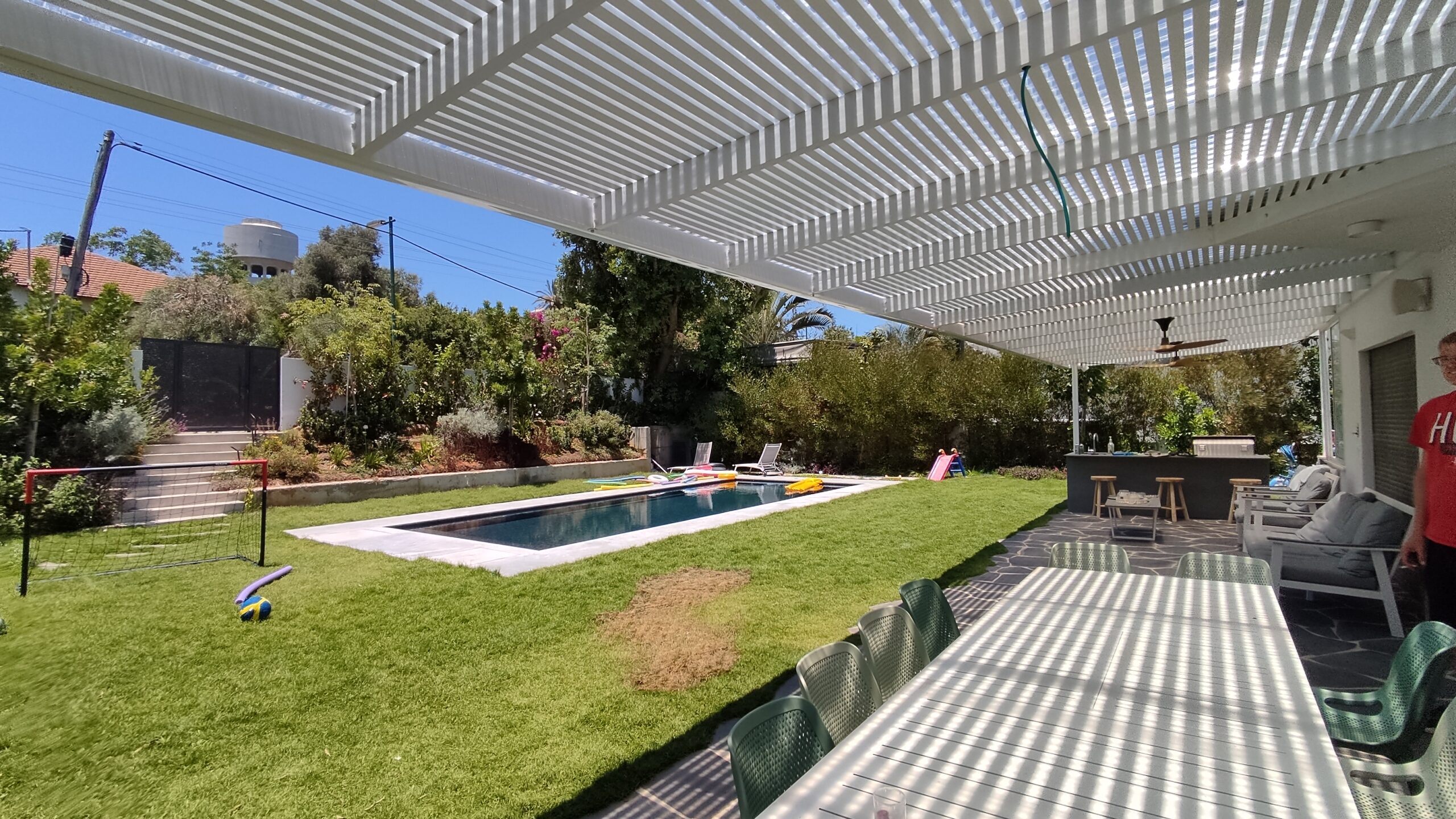 פרגולה קבועה הצללה עליונה. פרגולת אלומיניום קבועה דגם היי-טק הצללה עליונה פרופיל 120/40 רווח 2 ס”מ או 3-4 ס”מ קרוי נגד חדירת גשם סנטף\סנטף BH שקוף. פרגולת הייטק היא פרגולה עם טוויסט מודרני. עשוייה מאלומיניום ובעלת עיצוב מלוטש והיי-טקי. פרגולות אלו מותקנות בדרך כלל במרפסות, בתי עסק או בכניסה לבתים.